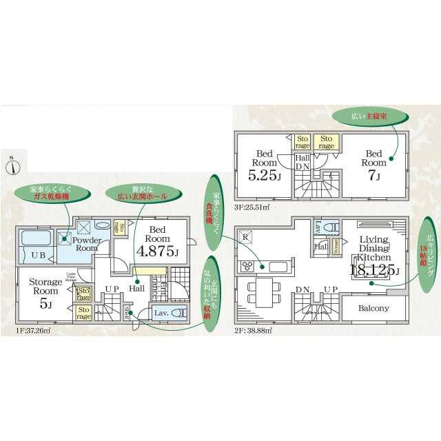 | 設備 | システムキッチン 床下収納 モニタ付インターホン ディンプルキー 浄水器 浴室乾燥機 追焚機能 シャワー付洗面化粧台 人感センサー付照明 ダウンライト 照明器具 | ||